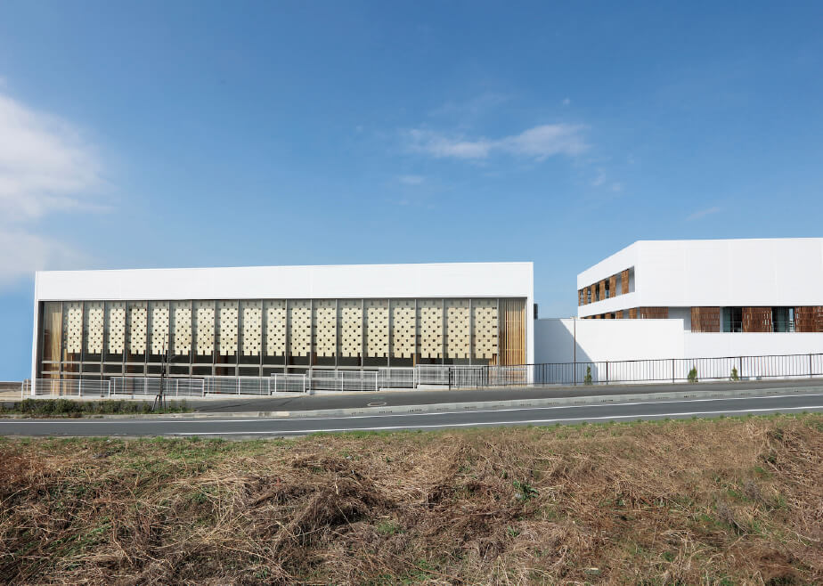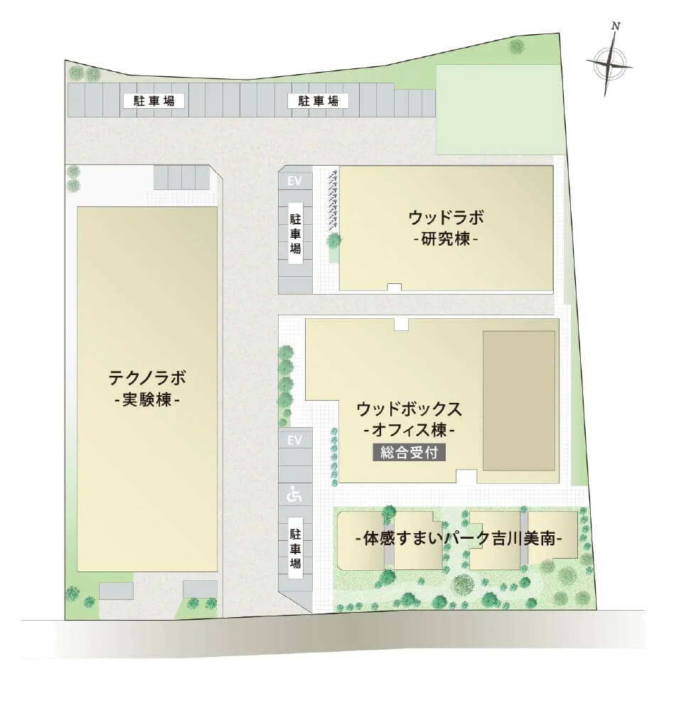 多くの人々や地域の小中学生が訪れ学びそして交流するポラステクノシティは、地域の方々との交流の場であるとともに社内研修施設としての機能を備えた「オフィス棟」、住まいに関する研究や開発を行う「研究棟」、家の構造と音環境についての実験設備が整う「実験棟」、実際の住まいを体験できる「体感すまいパーク」を有する複合施設です。