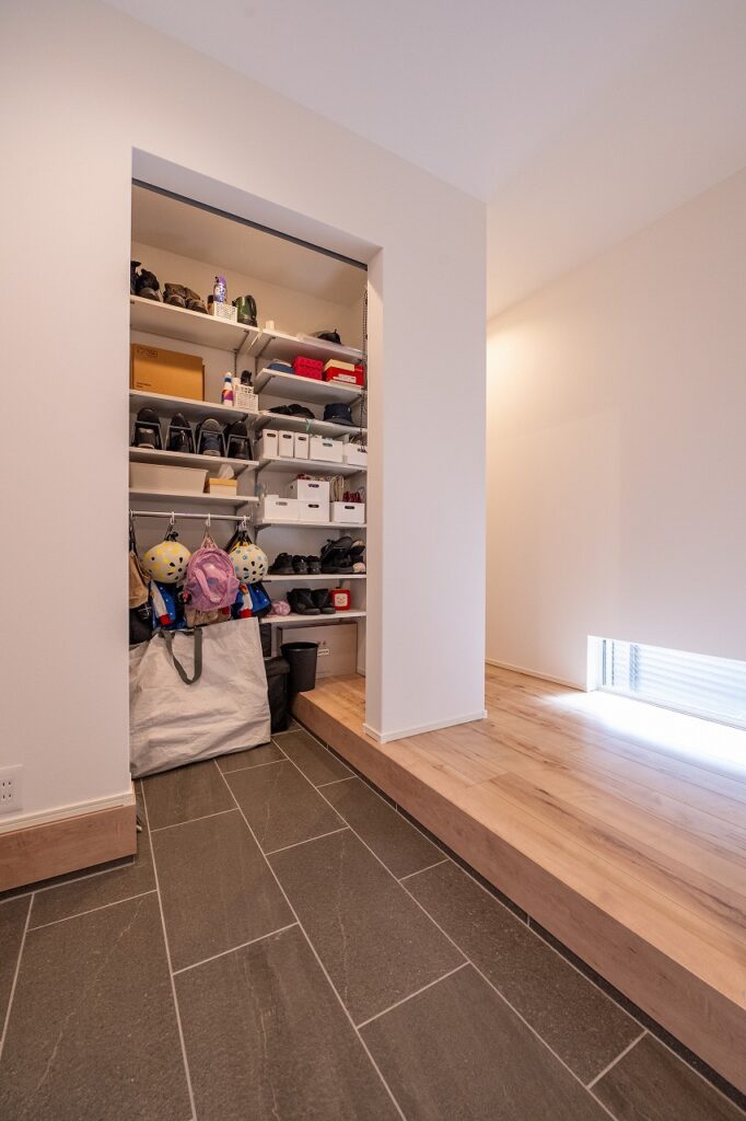 細長い土地ながら、広く感じる玄関を実現。ベビーカー、ゴルフ用品、キャンプ用品など、以前は置き場所に困っていた大物をまとめて収納できる大容量の玄関収納も設け、機能面でも大満足されています。