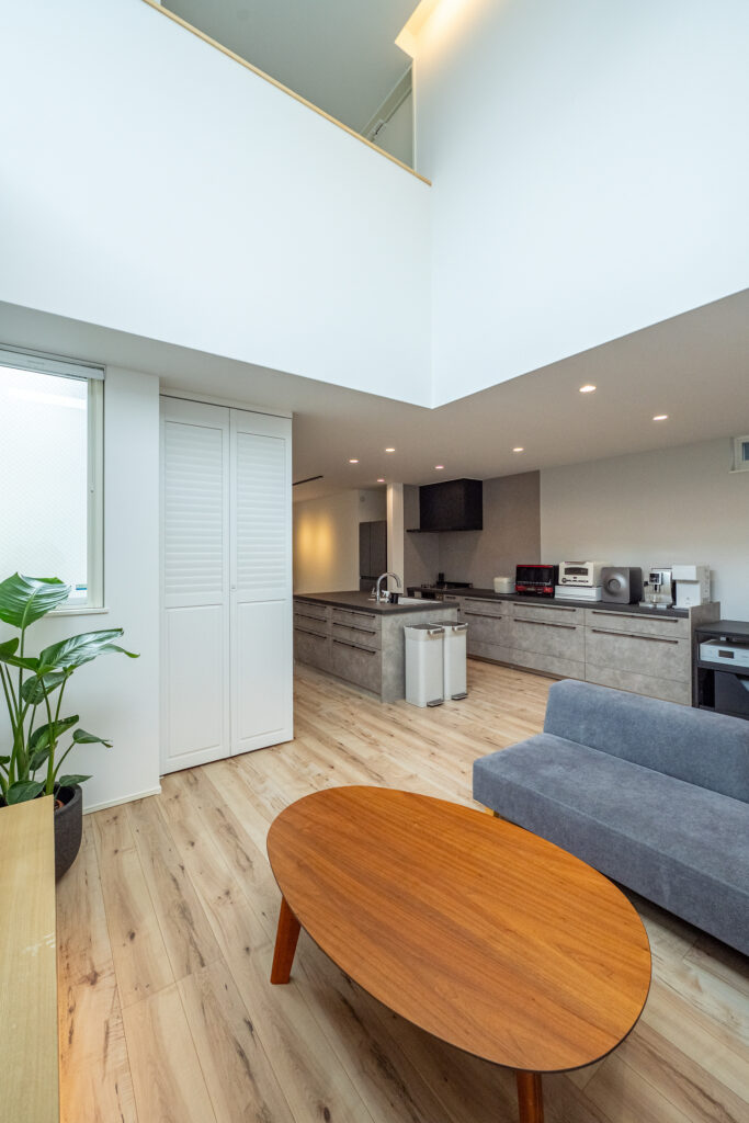 当初のプランから形を変え、現在の場所に設置した吹き抜けは、採光を確保し、家全体を広く感じさせる効果を生んでいます。
